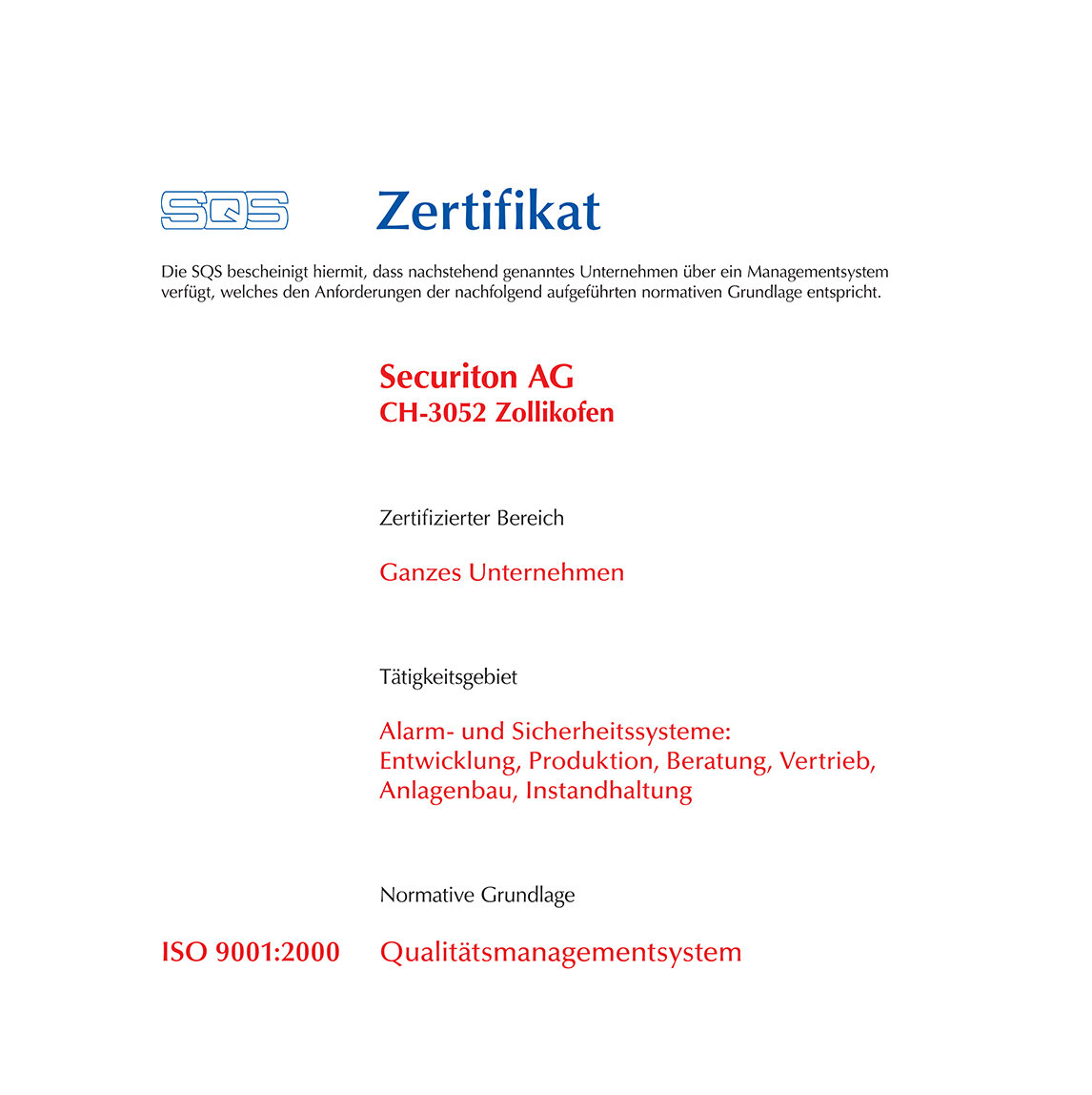 Securiton hat das Audit im Oktober 2001 bestanden und das neue SQS-Zertifikat nach ISO 9001: 2000 erhalten.