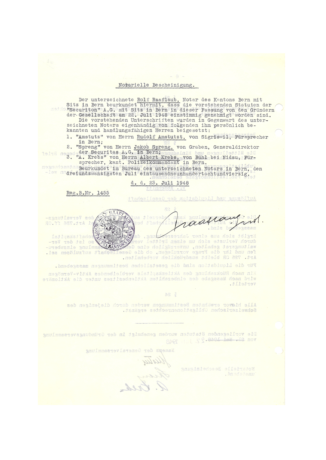 Am 22. Juli 1948 wurde die Securiton AG ins Handelsregister eingetragen und war somit offiziell gegründet.