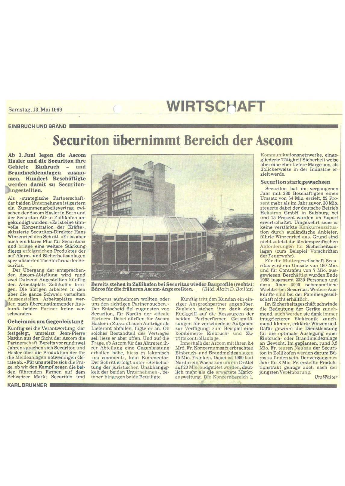Die Securiton übernahm auf den 1Juni 1989 die volle Verantwortung für den Bereich Einbruch-/Überfallmeldeanlagen der Ascom Hasler AG.