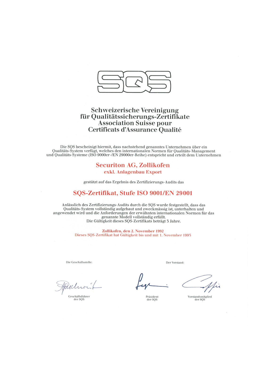 Nach zweijähriger intensiver Vorarbeit erfolgte am 16. November 1992 die Übergabe des SQS-Zertifikates an die Securiton.