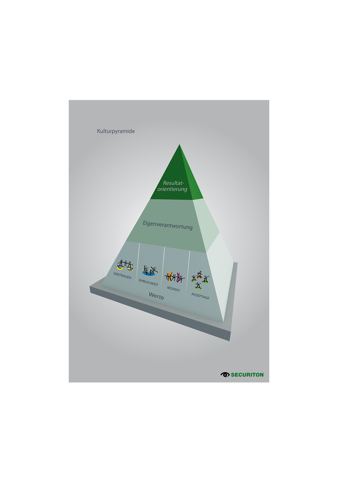 Die Securiton-Kulturpyramide setzt sich aus drei Stufen zusammen: Werte, Eigenverantwortung und Resultatorientierung. Anlässlich der diesjährigen Tour de Suisse (Mitarbeitendenveranstaltung) stellte die Geschäftsleitung die an Kaderworkshops erarbeitete Kulturpyramide vor.