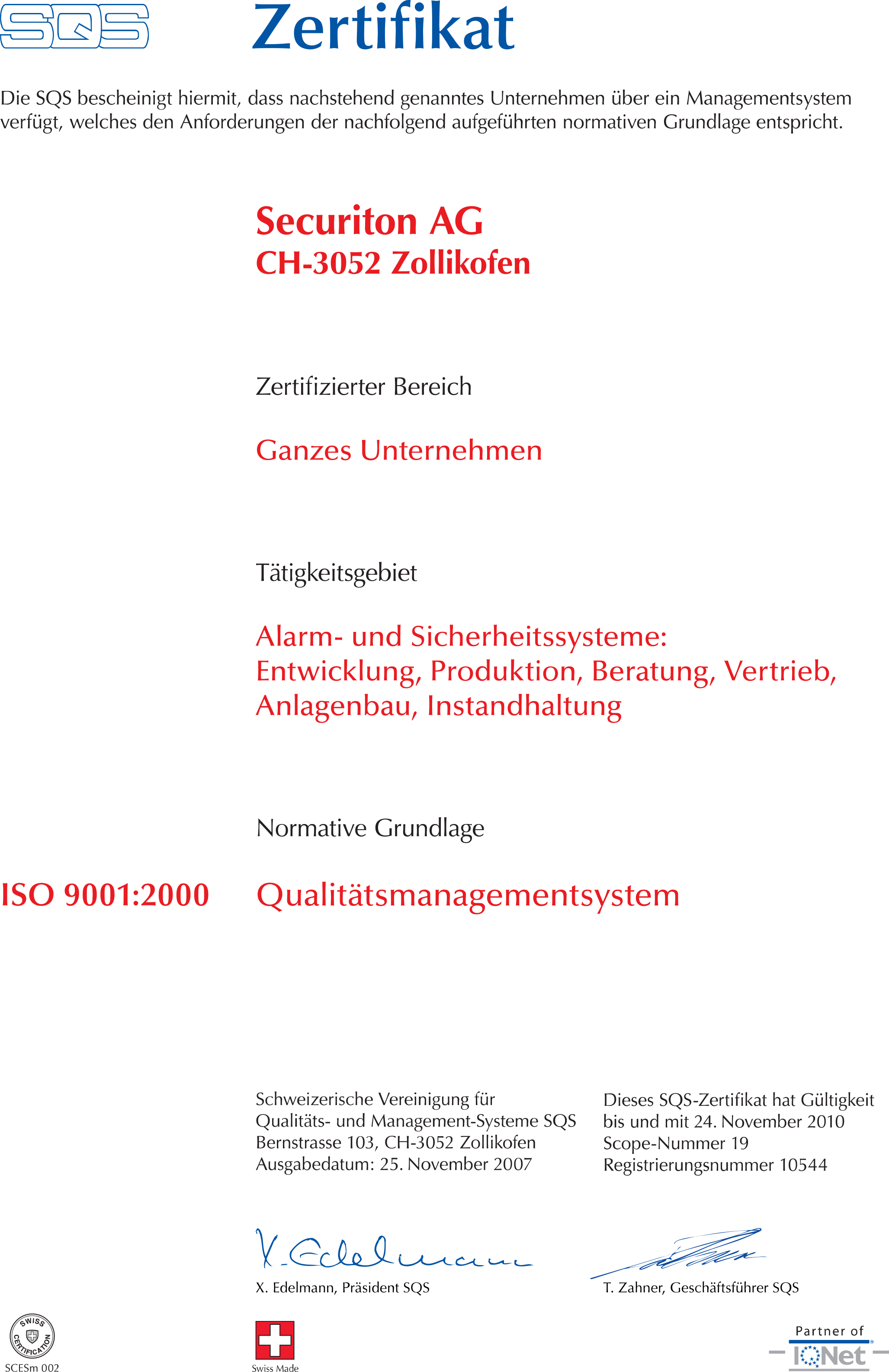 Das Securiton Prozessmanagement-System (PMS) wurde Mitte Oktober 2001 von zwei Auditoren der SQS (Schweizerische Vereinigung für Qualitäts- und Management-Systeme) nach der neuen Norm ISO 9001:2000 überprüft. Das Audit verlief in einer konstruktiven Atmosphäre und war für uns sehr erfolgreich, obwohl einige Dokumente noch nicht in definitiver Form vorhanden waren. Das neue Zertifikat nach ISO 9001: 2000, gültig bis 1. November 2004, bedeutet für uns nicht nur eine Belohnung, sondern auch eine Herausforderung.
