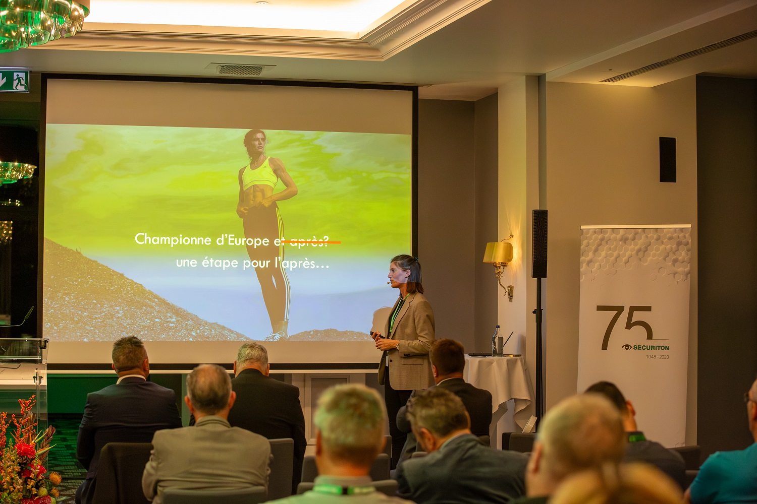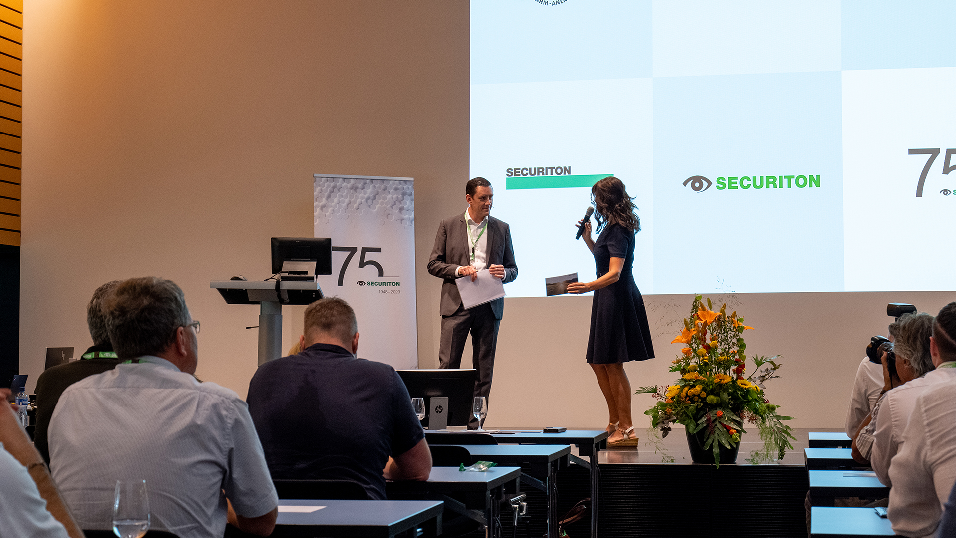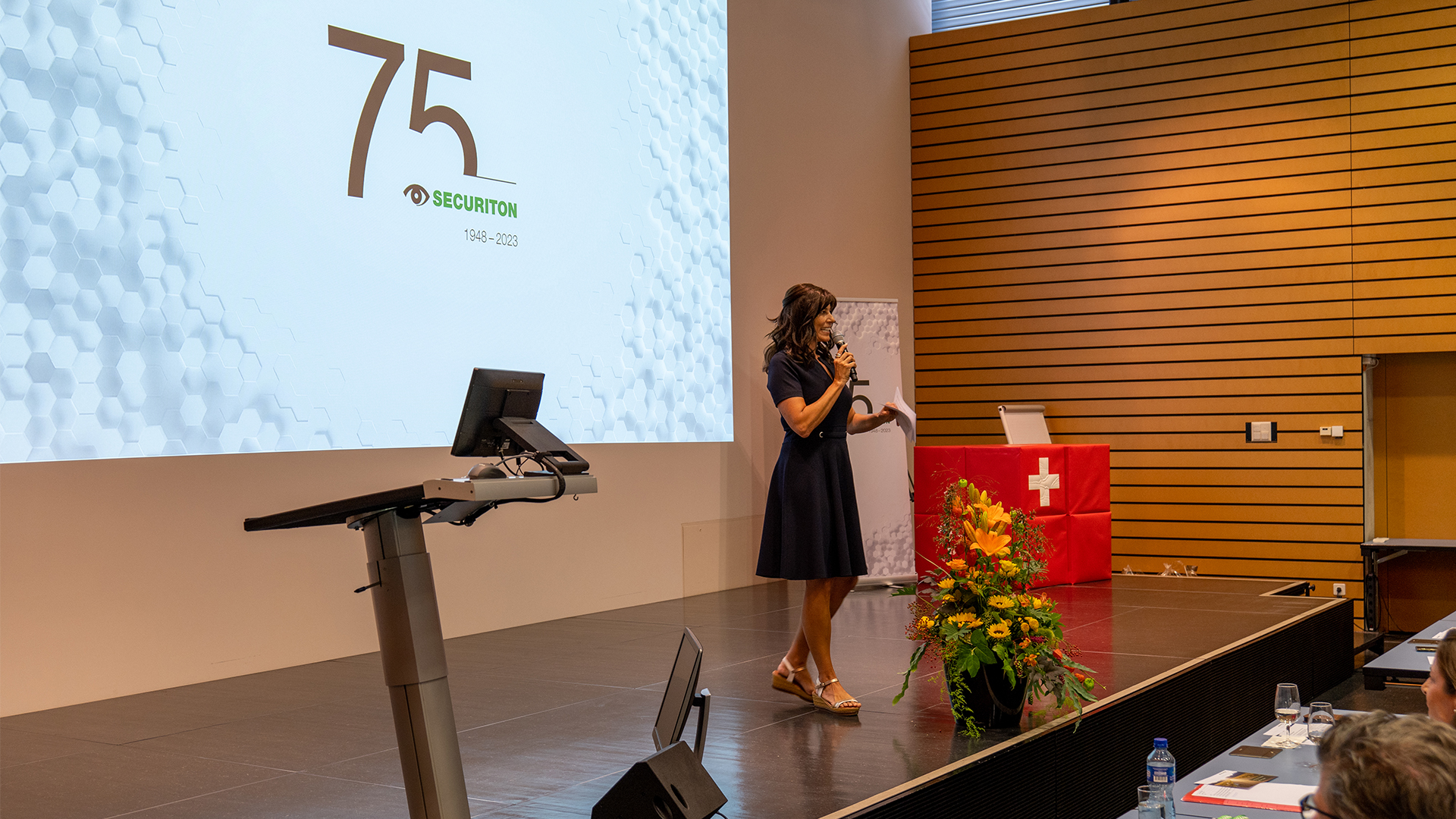 CEO Martin Altorfer eröffnete die Veranstaltung mit einem Rückblick auf die 75-jährige Unternehmensgeschichte von Securiton und informierte über aktuelle Themen und Trends. Michel Bettera, Gruppenleiter Projektmanagement nahm die Teilnehmenden mit auf eine Reise von den Ursprüngen bis zu den Innovationen in der Produkt- und Technologieentwicklung. Nach einer kurzen Pause stellte Elena Roos, Welt- und Europameisterin im Orientierungslauf, ihre persönliche Perspektive zu “Gestern - Heute – Morgen” vor. Begleitet und moderiert wurde der Anlass von Julie Arlin, Moderatorin beim Schweizer Fernsehen RSI.